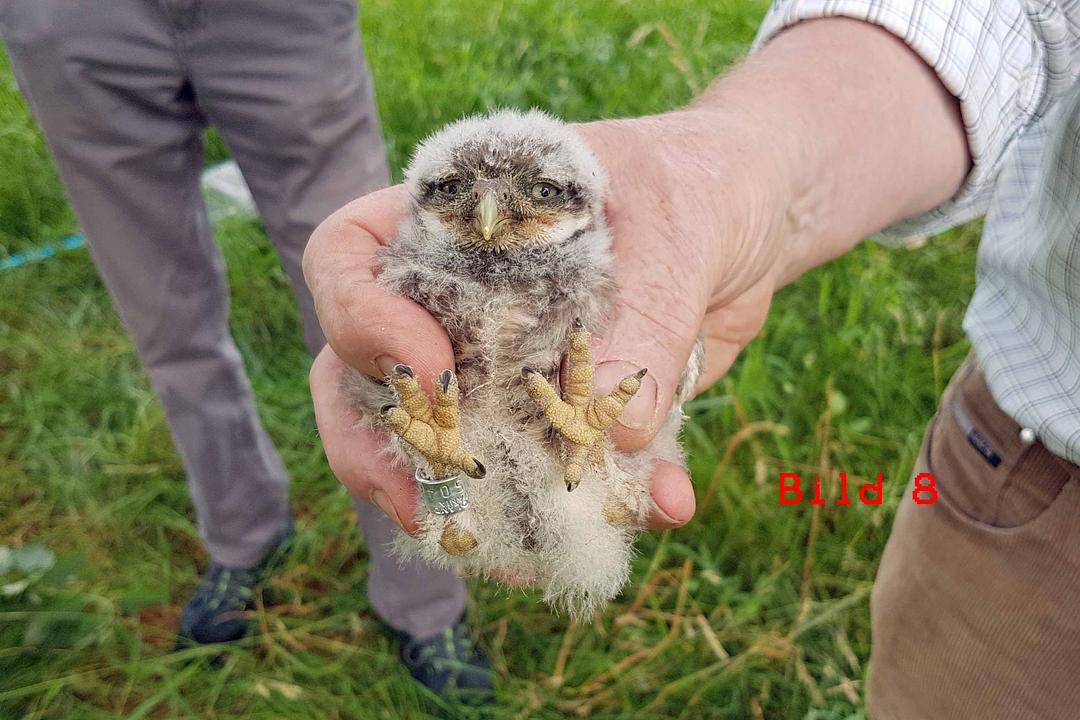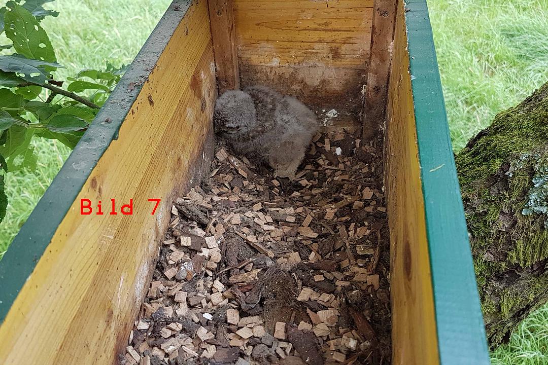 Bild 7 & 8; Wieder zwei Wochen später. Der Jungvogel hat sich gut entwickelt. Aber kein Vorrat an Mäusen? Hoffentlich geht das gut.