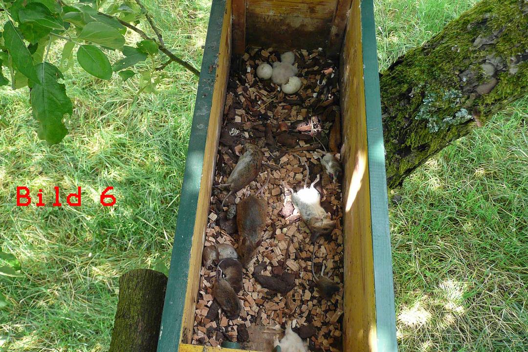 Bild 6; Zwei Wochen später. Ein gerader geschlüpfter Steinkauz, zu klein zum Beringen. Ein Ei nicht ausgebrütet. Man beachte die Anzahl von Mäusen als Futtervorrat.