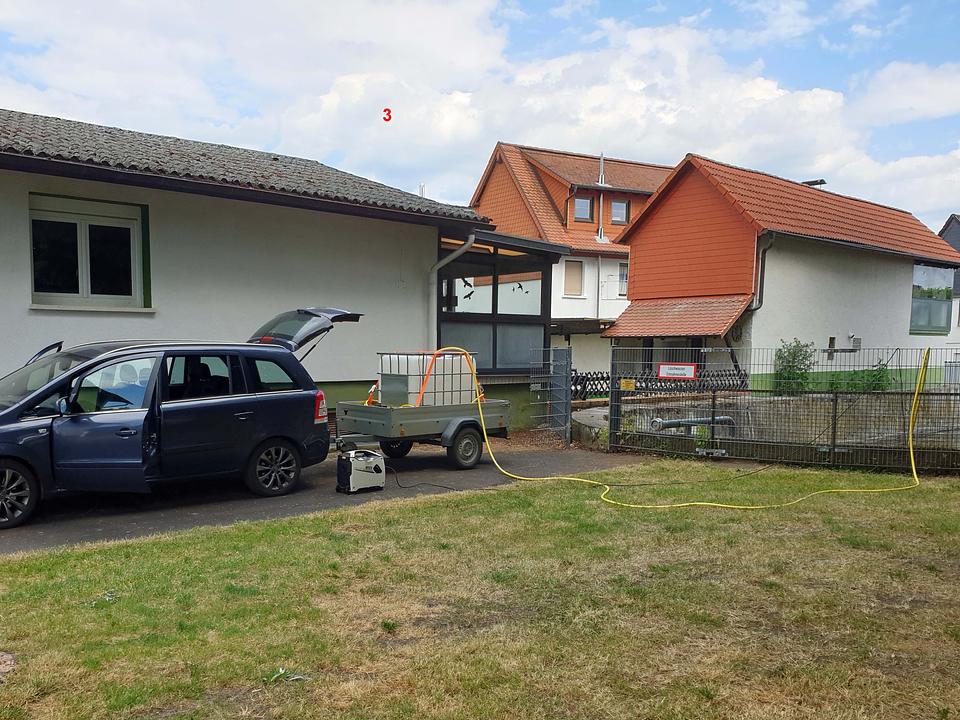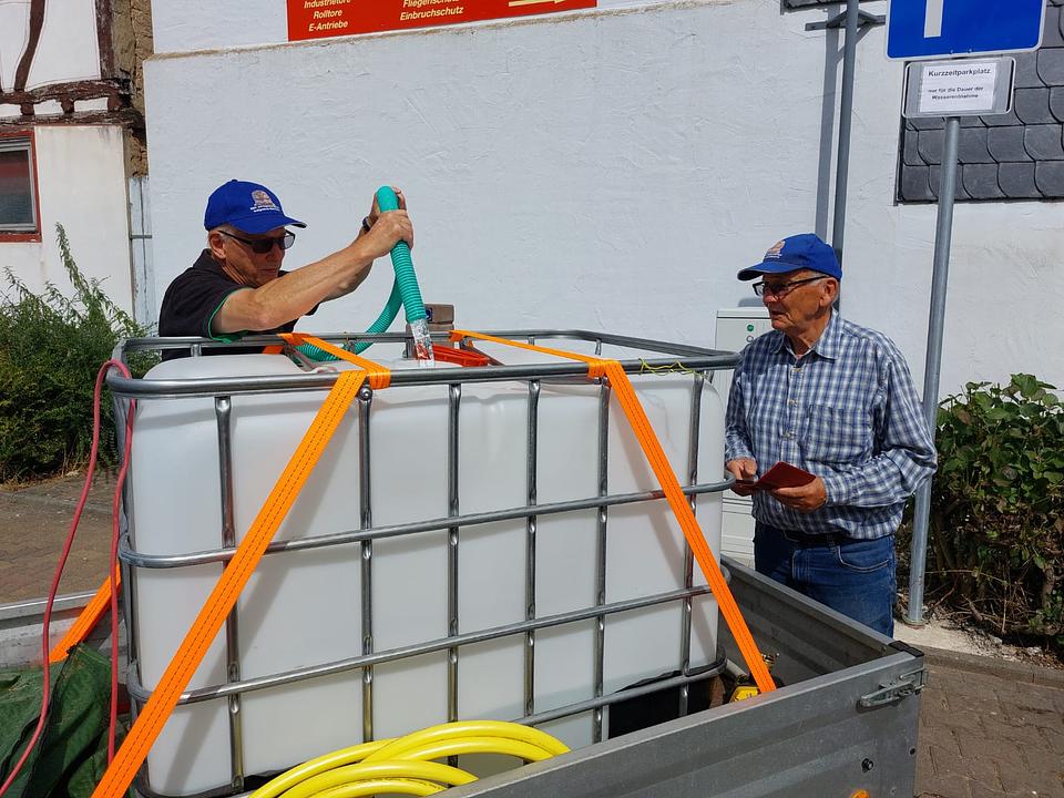 * das Fass ist in ca. 10 Minuten gefüllt, am Löschteich mit unserer Hebepumpe dauert