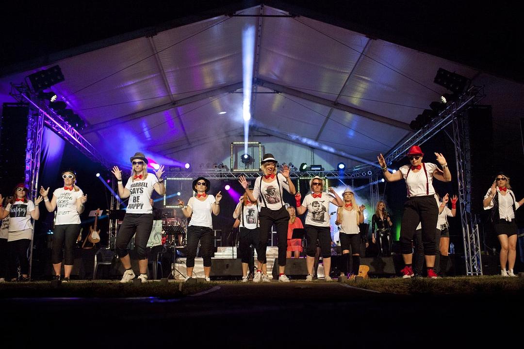 Was mit Bluesbrothers begann, setzte sich über den Abend hinwegs fort: Neben Einzeltiteln folgten Showblöcke mit passenden Songs und natürlich überraschenden Aktionen auf der Bühne. Auf Einspieler wurde dabei vollkommen verzichtet, alles war live, auch das Winnetou Intro, das live von den sieben Streichern und Bläsern gespielt wurde, und den Westernpart einläutete. Die Bläser wurden hierbei noch um Juliane Weinelt erweitert, die mit einem klar und präzise geblasenen Horn überzeugte und der Melodie ihren letzten Schliff verlieh. Zur "Rawhide" fuhren die Statisten auf die Bühne und lieferten sich eine Schiesserei. Hinter eine kleinen Wand aus Flammen stand Donnie Conrad bei "Ring of Fire". Dies war jedoch nicht die einzige Nummer, bei der er das Publikum überzeugte. Mit Eminems "Lose Yourself" überraschte er das Publikum mit einem Titel, an dem sich wohl kaum eine Coverband gewagt hat und den er überzeugend interpretierte. Nadine Schutt überzeugte die Zuschauer mit den Titeln "Happy", zu dem auch wieder zahlreiche Tänzer die Bühne betraten, und "Dear Future Husband". Eher für die Hardrocknummern zuständig war Erwin Jahn, der in knappen Ledershorts für verwunderte Gesichter im Publikum sorgte. Mit der Querflöte begeitete Thomas Gerlach bei Ian Andersons "Locomotive Breath". Nach einigen Jahren Pause waren Alex Kunz und Bernd Viehl wieder auf der Bühne zu sehen. Kunz begeisterte mit "Über sieben Brücken" und anderen Titeln, und von Bernd Viehl hätte man sich nach "Baby, du bist nicht alleine" noch mehr zu hören gewünscht. Mit "Let Me Entertain You" begeisterte Sven Harnischfeger und läutete den zweiten Teil des Abends ein. Sebastian Göbel, der sich maßgeblich für die zahlreichen Streicherarrangements verantwortlich zeigte, überzeugte mit einer ungewöhnlichen und sehr dynamischen Version von "Purple Rain", in der Marcel Waldeck sein Können als Gitarrist unter Beweis stellte. Das druckvolle und dennoch präzise Schlagzeug hierzu stammte von Thomas Bannert, der perfekt mit Bassist Michael Bauer harmoniert. Ebenfalls an der Gitarre zu hören war Thomas Küchenmeister, der bei "Loosing My Religion" auch zur Mandoline griff. Für die tiefen Töne zeichnete sich außerdem noch Jörg Karl verantwortlich.