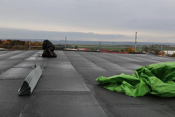 Ein Großteil der Arbeiten wurde bereits abgeschlossen. Als Bürgermeister Rouven Kötter und der im Rathaus zuständige Fachbereichsleiter Manfred Meißner sich in der vergangenen Woche ein Bild von den Arbeiten machten, stand die Montage der Blitzableiter zum Schutz des Gebäudes bevor. Das Gerüst wurde am Wochenende abgebaut. Wer vor der Wetterauhalle steht und das neue Dach bewundern will, wird enttäuscht sein: Vom neuen Dach sieht man kaum etwas. Lediglich die neue Einfassung aus Metall (Attika) und die neuen Fallrohre lassen darauf schließen. Die Fallrohre sollen in den nächsten Wochen noch an die Kanalisation angeschlossen werden. Derzeit wird das Wasser übergangsweise in eine Grünfläche geleitet.