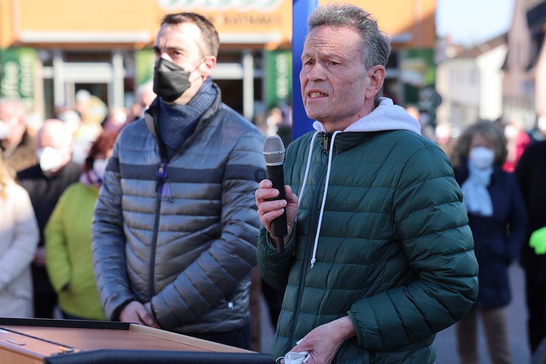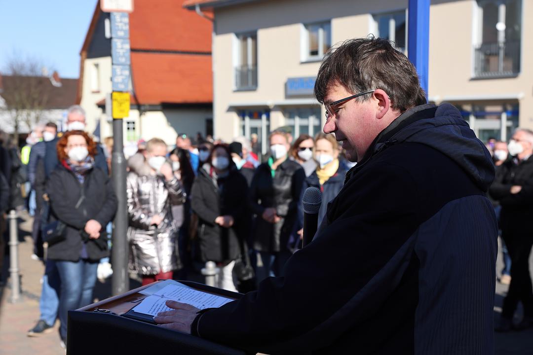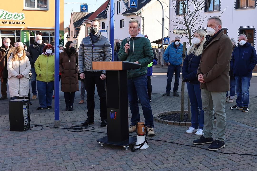 Die Flaggen von Europa, Deutschland und der Ukraine wehten bereits seit den Morgenstunden vor dem Wölfersheimer Rathaus. Schon eine halbe Stunde vor dem Beginn der Kundgebung füllte sich der Platz, der unter Wölfersheimern als „Brück“ bekannt ist. Menschen aus Wölfersheim und darüber hinaus waren zur Kundgebung gekommen. Bürgermeister Eike See begrüßte als Versammlungsleiter die zahlreichen Teilnehmer und ging zuerst auf die Hygienemaßnahmen ein. Er übergab das Wort an Pfarrer Lars Stephan, der für alle Wölfersheimer Kirchengemeinden sprach. Er rief zu Frieden und Solidarität auf und ging auf die von den Kirchengemeinden angebotenen Friedensgebete ein. „Dieser Krieg ist für die Ukrainerinnen und Ukrainer, aber auch für uns alle, eine menschliche Tragödie. Schon jetzt, dabei ist das Ausmaß des Krieges noch längst nicht absehbar,“ so Stephan.