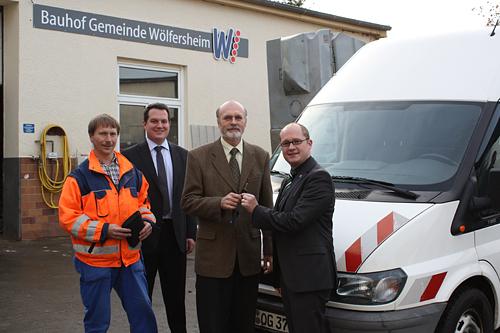 Bürgermeister Rouven Kötter und Bauhofleiter Dieter Bonarius nahmen das gebrauchte Erdgasfahrzeug von Oberhessengas-Geschäftsführer Herbert Kiefer und Markus Summ entgegen. Das Fahrzeug war bisher in der technischen Abteilung der Ogas im Einsatz und wurde beispielsweise zur Streckenkontrolle verwendet. In Wölfersheim wird es auf dem Bauhof seinen neuen Einsatzort finden.