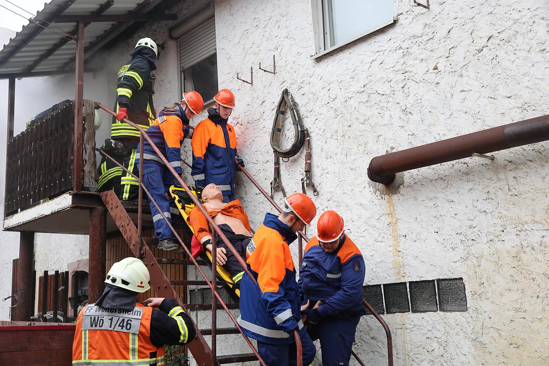 Es dauert nicht lange, bis die Räumlichkeiten mit Schlauch und schwerer Ausrüstung bei fast nicht vorhandener Sicht nach den Vermissten durchsucht werden. Eine Besonderheit der Übung war, dass auch die Jugendlichen der Jugendfeuerwehr, die in diesem Jahr in die Einsatzabteilung wechseln, mit „alarmiert“ wurden. Die künftigen Kameradinnen und Kameraden unterstützten bei verschiedenen Aufgaben. So wurden beispielsweise vom Atemschutztrupp gerettete Verletzte über eine Trage aus dem Gefahrenbereich transportiert. Nachdem der Brand gelöscht war und die Räumlichkeiten mit einem Lüfter entraucht waren, war die Übung noch nicht zu Ende. Damit Schläuche und andere Ausrüstung beim nächsten Einsatz, der auch ein Ernstfall sein könnte, wieder sofort griffbereit sind, wurde alles wieder ordentlich verstaut.