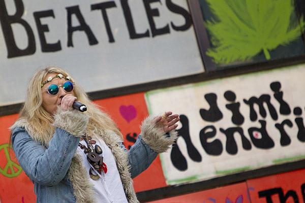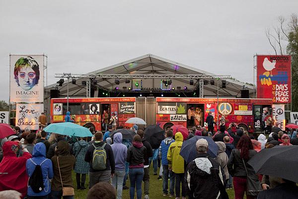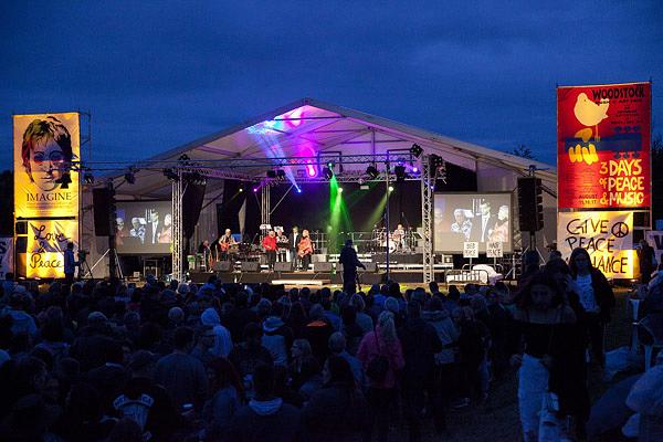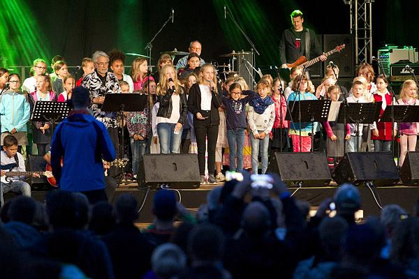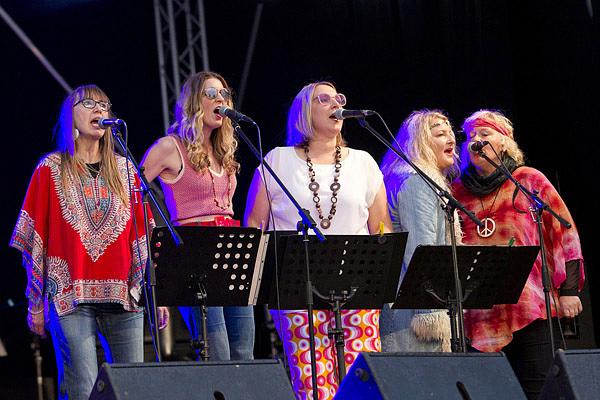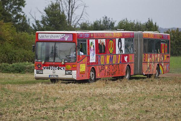 Das musikalische Kult-Event stand anlässlich des 50-jährigen Jubiläums von Woodstock unter dem Motto "Love and Peace". Bereits im Eingangsbereich liefen die Besucher vorbei an liebevoll gestalteten Wänden. Auch seitlich der Bühne sorgten große Banner für den entsprechenden Rahmen. Mit einem bunt bemalten Bus fuhren die Musiker und Statisten als Hippies verkleidet auf die Bühne. Dem Thema Woodstock widmete sich der komplette erste Programmteil. Von Jannis Joplins "Mecedes Benz" bis hin zu "My generation" von The Who wurde eine breite Auswahl von Songs gespielt, die durch Akzente wie "Looking for Freedom" ergänzt wurden. Abgerundet wurde der Programmteil durch einen Auftritt des Schulchores der Jim-Knopf-Grundschule, der gemeinsam mit Thomas Gerlach das Lied "Wir ziehen in den Frieden" sang.