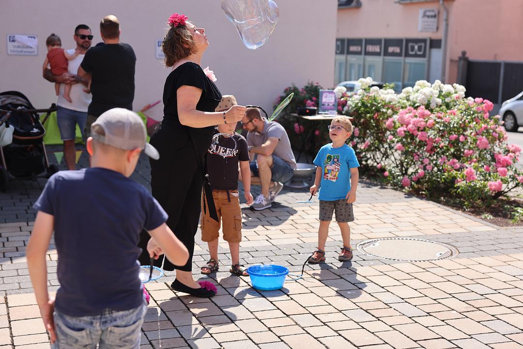 Schon am Eingang zum Gelände wurden die Besucher von Seifenblasenkünstlerin Christiane Alles begrüßt, die mit ihren kleinen und riesigen Seifenblasen nicht nur den mitgebrachten Geschwistern ein Lächeln ins Gesicht zauberte. Bürgermeister Eike See und die im Rathaus für die Kindertagesstätten zuständige Fachbereichsleiterin Nicole Stelzner-Lehmann begrüßten die Eltern am Eingang der Scheune. Im Grußwort wurde deutlich, welchen Stellenwert das Thema Kinderbetreuung in der Gemeinde einnimmt. Stelzner-Lehmann betonte, dass der Baby- und Kleinkinderempfang eine gute Möglichkeit ist erstmals in Kontakt zu treten und Fragen zu beantworten. Natürlich steht die Verwaltung auch im Anschluss daran für weitere Fragen zur Verfügung.