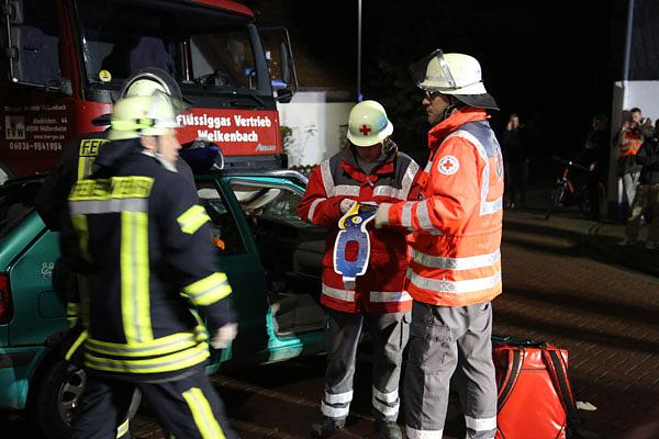 Der Boden rund um den verbeulten Kleinwagen liegt voller Scherben. Mitten auf der Kreuzung steht das Fahrzeug vor einem mit Gas beladenen LKW. Die Rettungkräfte von Feuerwehr und DRK versuchen eine Person aus dem Fahrzeug zu befreien. Anwohner kommen erschrocken auf die Straße. Doch einer der Anwohner hat eine Pfanne auf dem Herd vergessen, was zu einem Wohnungsbrand führt. Der Brand entwickelt sich schnell und im Haus sind mehrere Personen eingeschlossen. Zum Glück handelt es sich bei diesem Schreckensszenario nur um eine Übung, mit der die Einsatzkräfte der Freiwilligen Feuerwehren aus Wölfersheim für den Ernstfall probten.