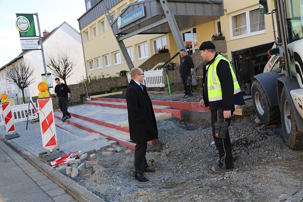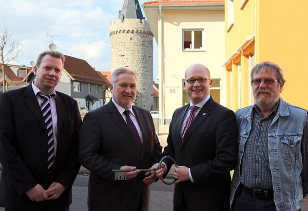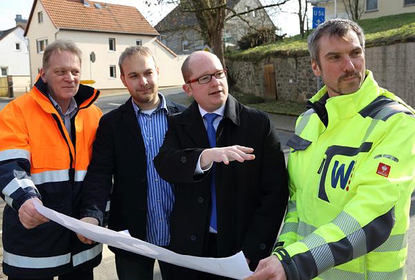 Unmengen von Schlamm und Wasser bahnten sich 2012 den Weg in den Wohnbacher Ortskern. Die Gemeinde Wölfersheim handelte schnell und konsequent: Im Rahmen von zahlreichen Informationsveranstaltungen, Runden Tischen und Gremiensitzungen wurde ein Hochwachsserschutzkonzept für Wohnbach erarbeitet. Dieses beinhaltet die Errichtung eines Retentionsbeckens im Westen von Wohnbach, Verbesserungen der Situation auf den Ackerflächen, von denen die Schlammmassen kamen und –als teuerster und umfangreichster Baustein- eine Neuordnung der Kanäle im Kreuzungsbereich der Berstädter Straße und der Birkenstraße. Nun startet diese Baumaßnahme, die Überschwemmungen künftig verhindern soll. Bürgermeister Rouven Kötter, der Vorsitzende des Bauausschusses Jens Dieffenbach, der im Rathaus zuständige Fachbereichsleiter Markus Klopsch und der Planer Jürgen Hetterich vom Ingenierbüro JHI gingen die einzelnen Bauabschnitte bei einem Termin vor Ort gemeinsam durch.