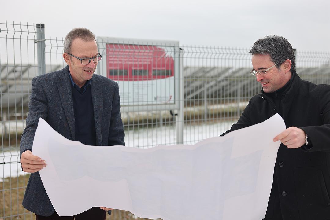 Der Wölfersheimer Solarpark ist jetzt schon der größte in der Wetterau. Auf einer Fläche von ca. 10 Hektar wird mit den rund 22.000 Solarmodulen genug Strom erzeugt, um damit rechnerisch etwa die Hälfte aller Haushalte der Gemeinde Wölfersheim mit Strom zu versorgen. Das Projekt ist nicht nur ein Gewinn für die Umwelt, sondern auch für die Wölfersheimer Gemeindekasse. Die Bestandsanlage soll in diesem Jahr mit leistungsfähigeren Solarmodulen ausgestattet werden, die unterem Strich auch zu einem höheren Gewinn führen werden. Bürgermeister Eike See traf sich mit Joachim Arnold, dem Vorstandsvorsitzenden der OVAG, zu einem fachlichen Austausch vor Ort.