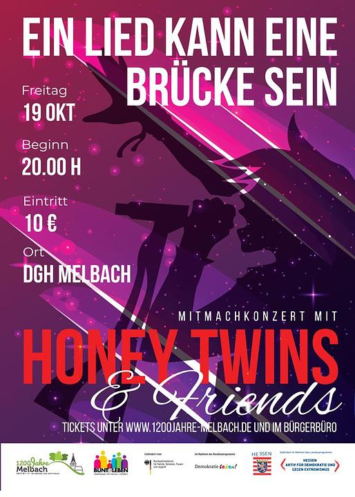 Mit einem rauschenden Finale endeten die Festjahre 2017 und 2018. Der Verein „Gemeinsam für Melbach“ hatte zum Mitmachkonzert „Ein Lied kann eine Brücke sein!“ mit den Honey Twins in voller Bandbesetzung in das Melbacher Dorfgemeinschaftshaus eingeladen. Viele Musikfreunde waren der Einladung gefolgt und sie erlebten einen großartigen Konzertabend.