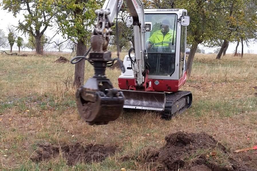 Die 30 Obstbäume, gestiftet von der Gemeinde, und das Material wie Pfosten und Pflanzerde, sind bestellt. Die Pflanzlöcher wurden bereits ausgehoben und sind von Mitarbeitern des Bauhofes gleich gründlich gewässert worden.