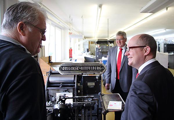 Die großen Druckmaschinen laufen auf Hochtouren. Blatt für Blatt zieht die Maschine die großen Papierbögen ein. Immer wieder füllt der Drucker das Papier auf und kontrolliert die Einstellungen, damit jeder Druck perfekt ist. "Mit der Maschine schaffen wir bis zu 14.000 Bögen in der Stunde." berichtet Andreas Kugland, der die Wetterauer Druckerei in Friedberg in der nunmehr dritten Generation führt und zieht einen der Bögen aus dem großen Stapel und zeigt es seinen Gästen, dem Wölfersheimer Bürgermeister Rouven Kötter und der Wetterauer Sozialdezernentin Stephanie Becker-Bösch, die überrascht das neue Wölfersheimer Kinderkulturprogramm in den Händen hielten.